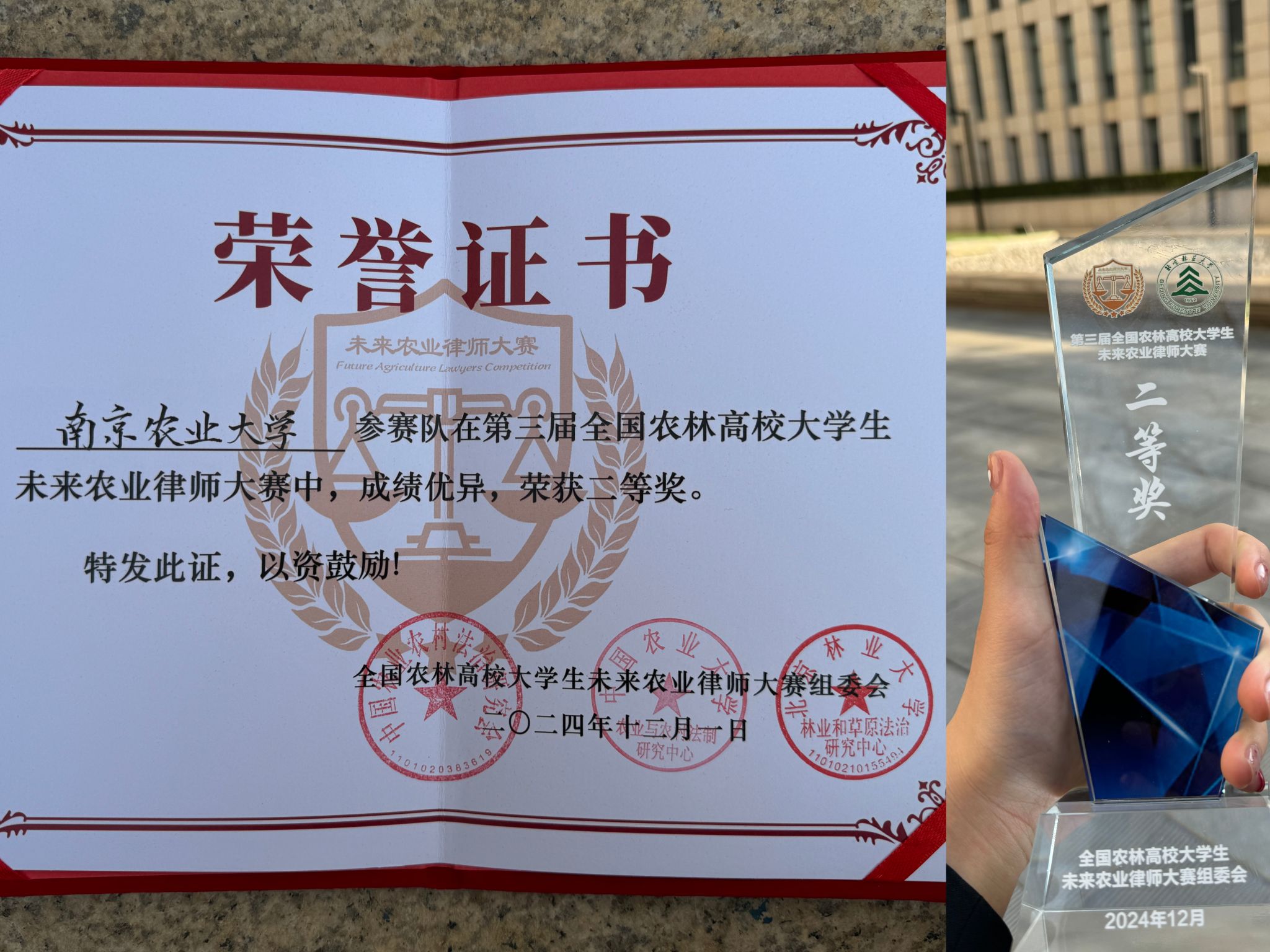 12月1日,第三届全国农林高校大学生未来农业律师大赛在北京落下帷幕,大赛吸引了来自全国22所农林高校的代表队参与其中。吃瓜网由张梦婷、吴佳奇、董书源、康钿苓、王卓玥、陈思(研究生)6名本、研学生组成的代表队,在法律系系主任孙永军、专业教师尹雪英带队指导下,最终斩获全国二等奖,并获“最佳文书”荣誉称号。